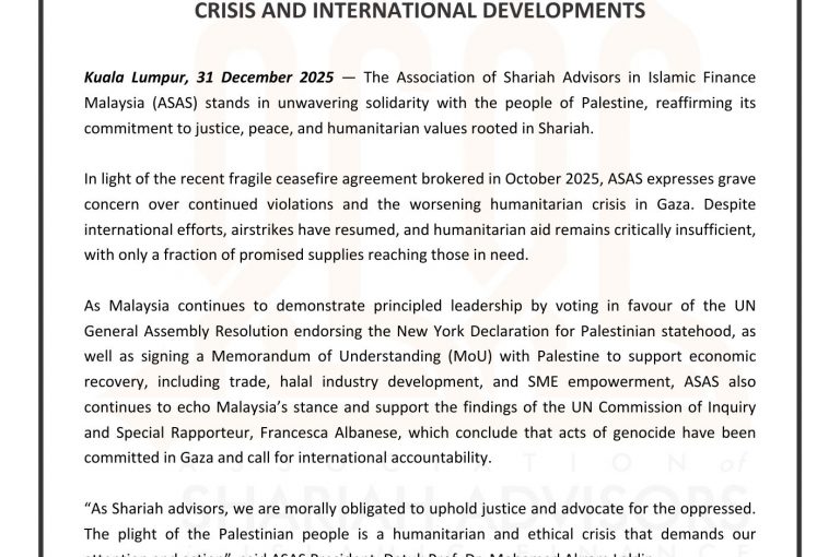 MEDIA RELEASE ASAS REAFFIRMS SOLIDARITY WITH PALESTINE AMID ONGOING CRISIS AND INTERNATIONAL DEVELOPMENTS Kuala Lumpur, 31 December 2025 — The Association of Shariah Advisors in…