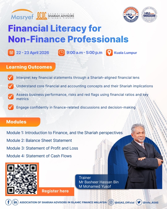 We are pleased to announce the commencement of ASAS and MASYREF Collaboration with the title of Financial Literacy for Non Finance Professionals Part 1, a two day intensive training designed to equip professionals with essential financial knowledge through a Shariah aligned lens.