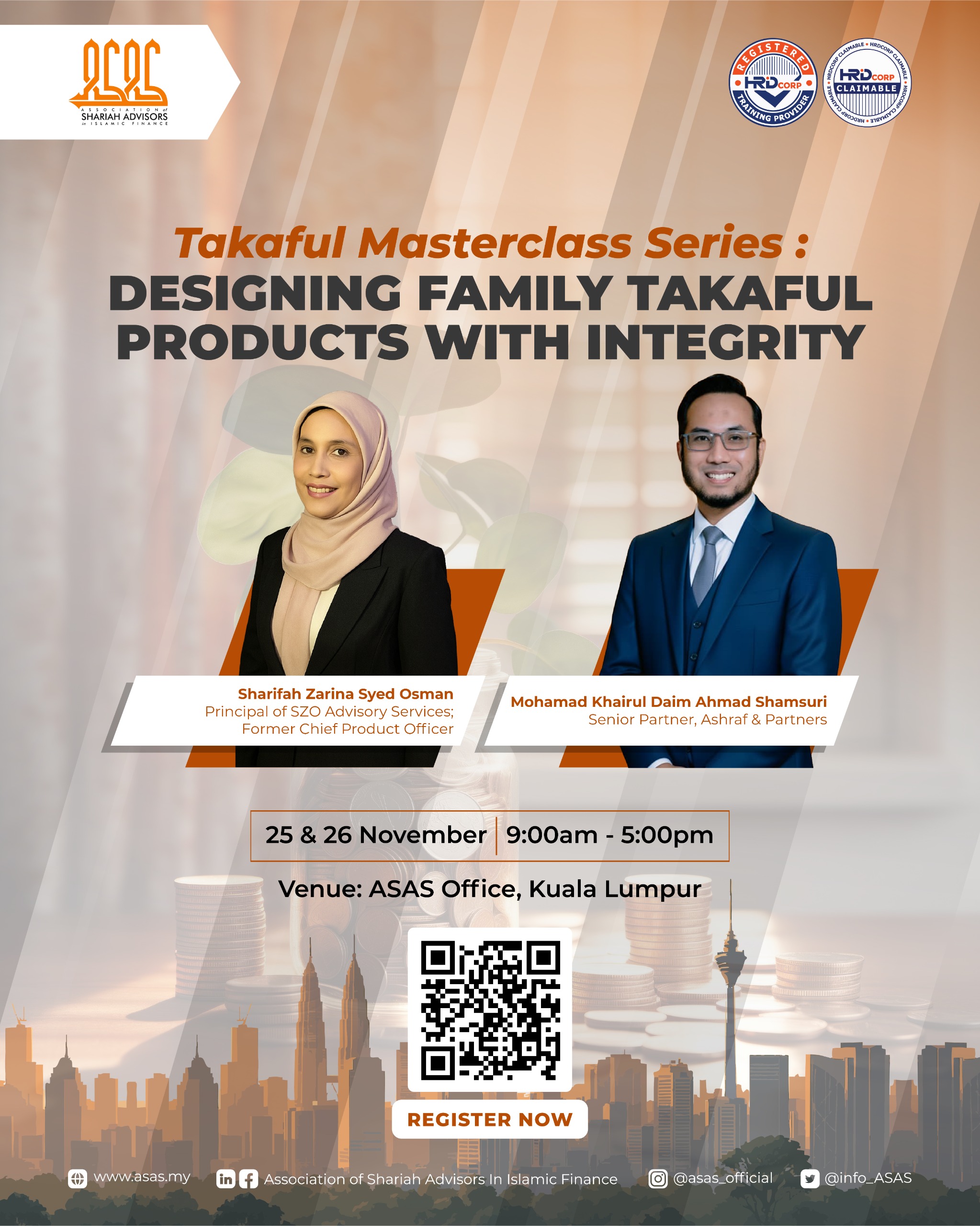 🔥 Level Up Your Takaful Expertise! Join our Takaful Masterclass Series: Designing Family Takaful Products with Integrity 📅 Date : 25 & 26 November 2025 🕘 Time : 9:00 AM – 5:00 PM 📍 Venue : ASAS Office, Kuala Lumpur Featuring industry experts: ✅ Sharifah Zarina Syed Osman – Principal of SZO Advisory Services ✅ Mohamad Khairul Daim Ahmad Shamsuri