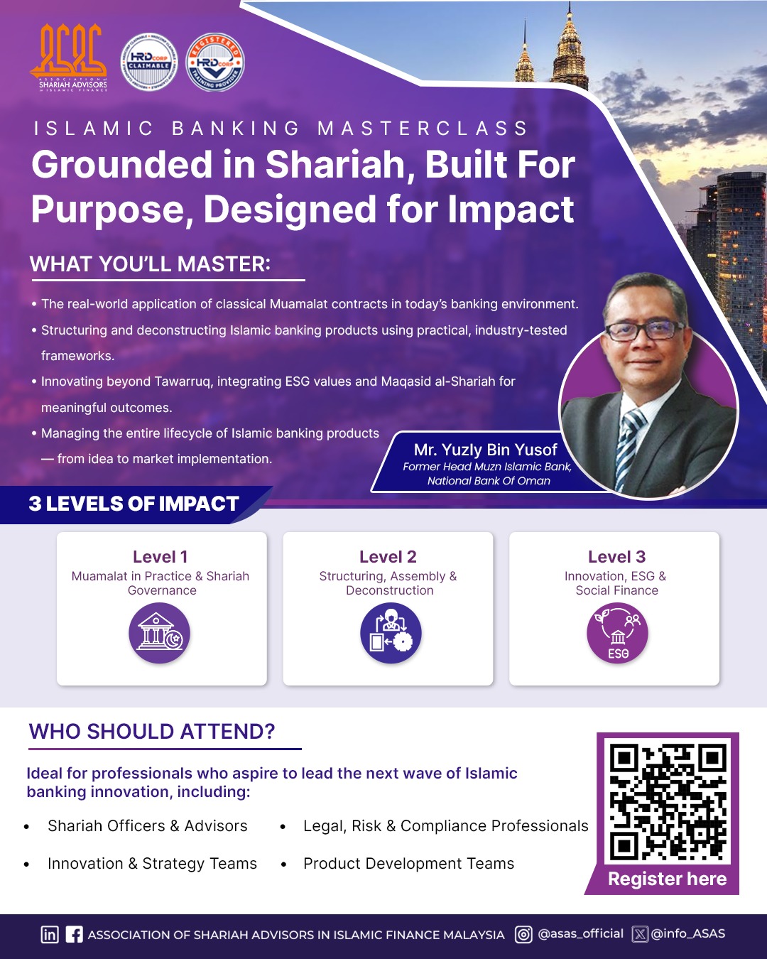 🚀 ISLAMIC BANKING MASTERCLASS SERIES 2025 Grounded in Shariah, Built for Purpose, Designed for Impact! Join our 3-level masterclass by Association of Shariah Advisors in Islamic Finance Malaysia (ASAS) that designed to empower Islamic finance professionals with real world application, strategic structuring, and innovation for sustainability. 📘 Level 1: Muamalat in Practice & Shariah Governance ⚙️ Level 2: Structuring, Assembly