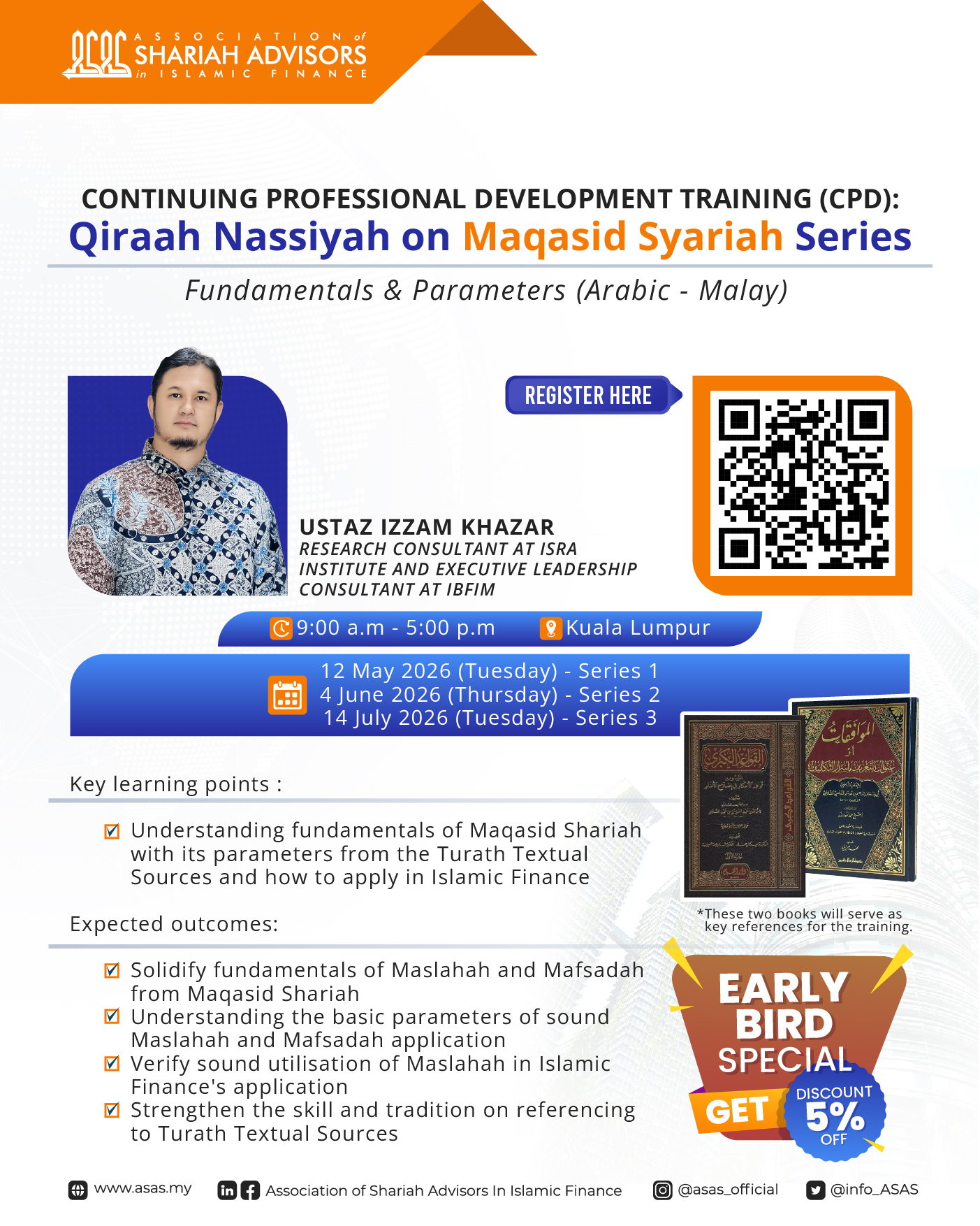 Greetings from the Association of Shariah Advisors in Islamic Finance (ASAS)!ASAS will be organizing a Continuous Professional Development (CPD): Qiraah Nassiyah on Maqasid Syariah SeriesThe Qiraah Nassiyah on Maqasid Syariah Series is not just another training—it’s a journey back to turath (classical Islamic texts), where authentic principles are built, refined, and preserved. From these rich foundations, you will learn how